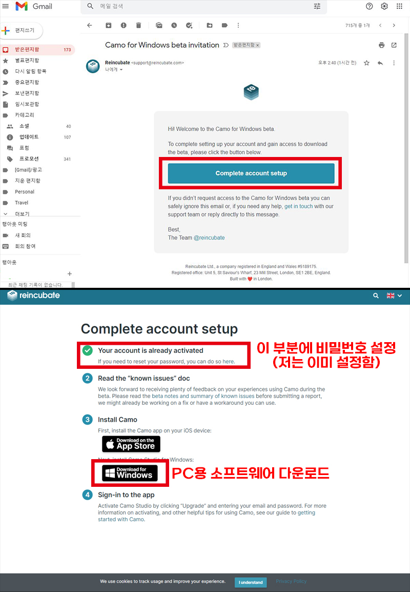 본인 메일로 들어가시면 account를 만드는 링크와 함께 비밀번호를 설정하고 Camo Studio 소프트웨어 설치파일을 다운로드를 할 수 있습니다. 설치파일을 실행시키면 간단하게 Camo Studio 소프트웨어를 설치할 수 있습니다.