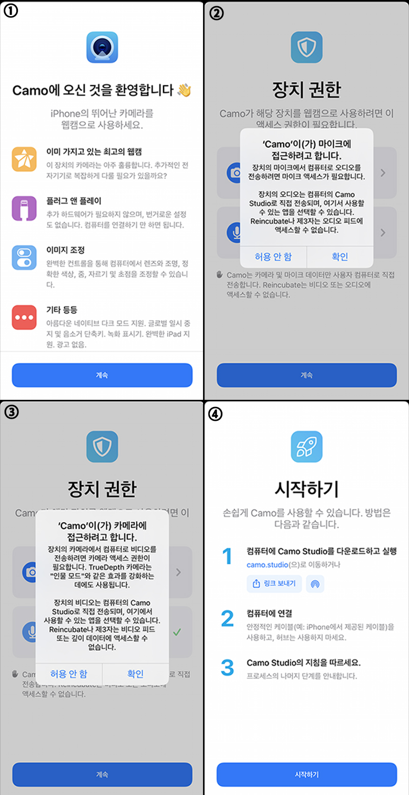 아이폰 등의 Apple 디바이스 기준으로 설명하자면 먼저 앱스토어에서 Camo 애플리케이션을 다운받습니다. 당연히 무료로 다운 받을 수 있습니다. 다운 받고 어플리케이션을 실행시키면 몇가지 카메라와 오디오장치 권한 설정 메시지가 나옵니다. 모두 확인을 눌러 권한 허용을 시켜주면 어플리케이션 상에서는 준비 완료입니다.