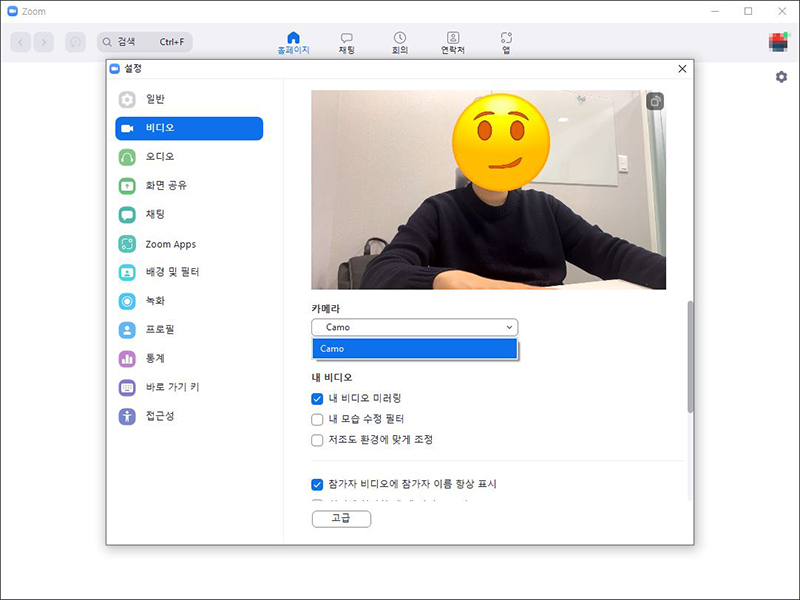 Camo 웹캠을 이용하여 Zoom(줌) 화상 회의 참여