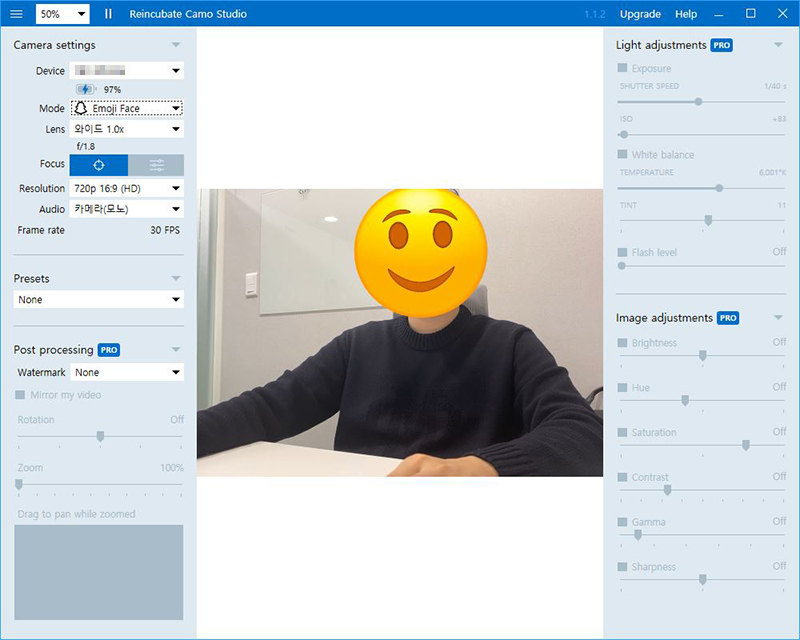 Camo Studio 소프트웨어를 통해 바로바로 카메라 설정 등을 할 수 있습니다. 다양한 모드(뷰티 모드 등), 카메라 해상도 조절(FHD는 Pro에만 해당됨), 워터마크 제거 등 다양한 기능을 무료로 할 수 있으며, 추가로 한 달에 약 $5로 상세한 카메라 설정 등 Pro기능을 사용할 수 있습니다.